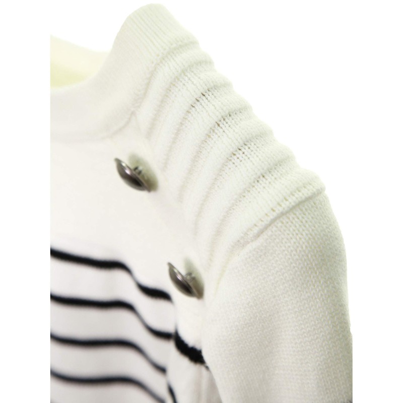 AmélieBoutik Women Crewneck Striped Military Button Embellished Pullover Sweater(Off-White Large)