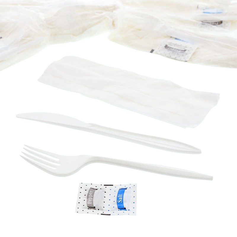 - CONTAINS: Each kit contains a white medium weight fork and knife, a 12" x 13" napkin, and salt and pepper packets. The cutlery is made from medium weight polypropylene