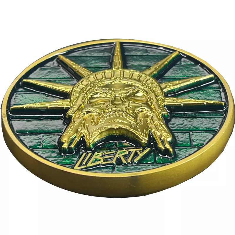 Large and thick 2.75 inch coin weighing a heavy 6.8 ounces. Featuring Benjamin Franklin holding revolvers and a Statue of Liberty skull. 3D bricks below a green enamel.