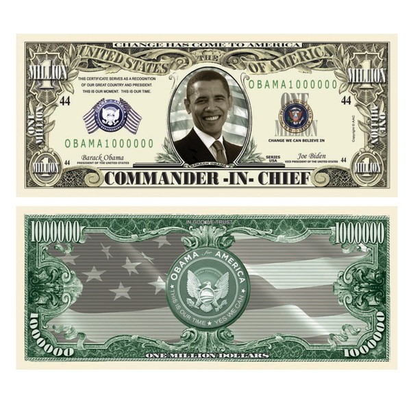 - Million Dollar Bill featuring Barack Obama! Pack of 5 bills.