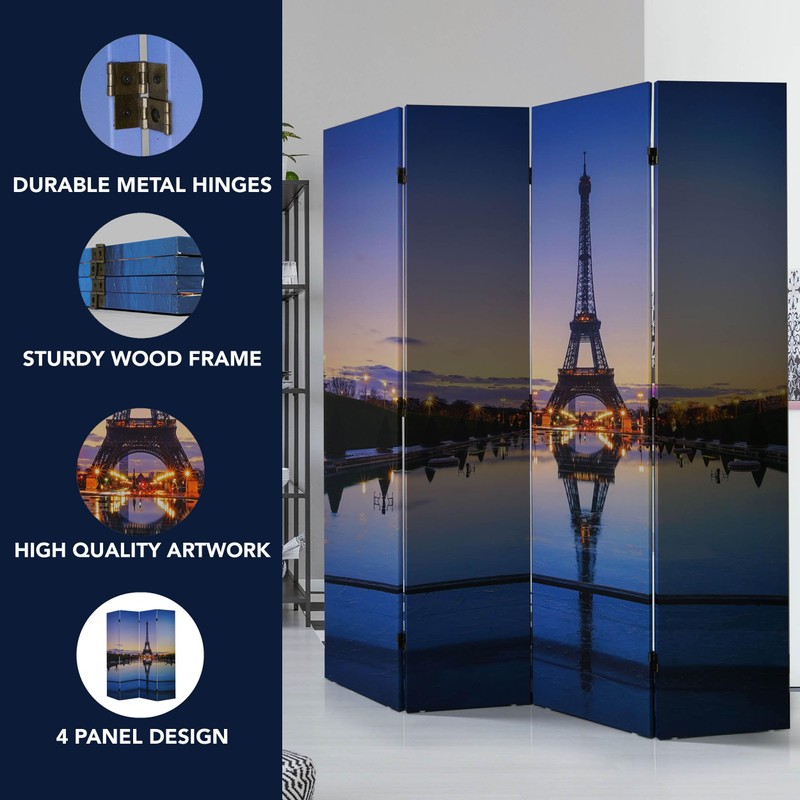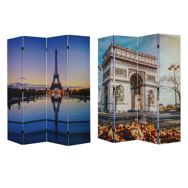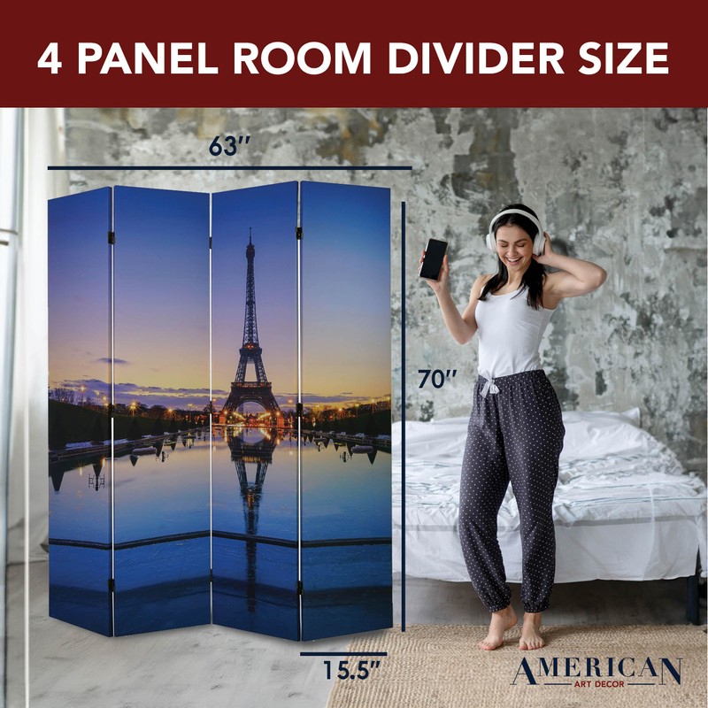 American Art Decor 4-Panel Dressing Room Divider - Double-Sided Paris Eiffel Tower & Arc de Triomphe Canvas - Portable Folding Privacy Screen for Room Separation (70" H)