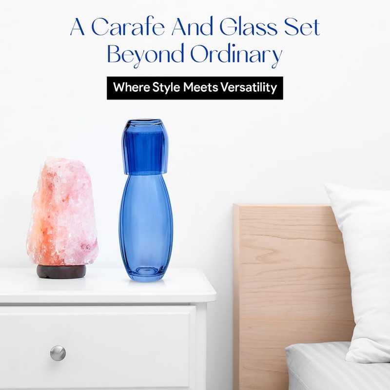 - 2-PIECE SET: Expertly crafted of glass, this set includes a carafe with a tumbler that doubles as a lid to keep water or another liquid clean for drinking. It makes a great addition to a bedside table for quenching thirst in the middle of the night.