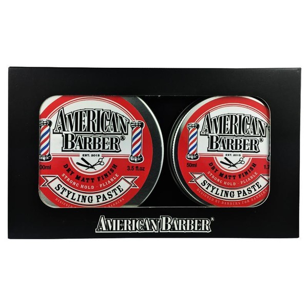 American Barber Styling Paste 50ml-100ml Duo Bundle is a hair styling product that provides a strong but pliable hold with a dry matt low sheen finish.