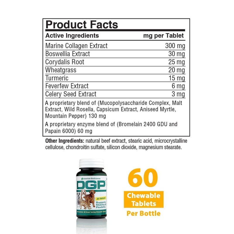 - ENHANCED QUALITY OF LIFE C DGP supports mobility and flexibility for your pet while easing joint aches and discomfort caused by daily exercise, activity, and training. You'll see your pet's life improve right before your eyes.