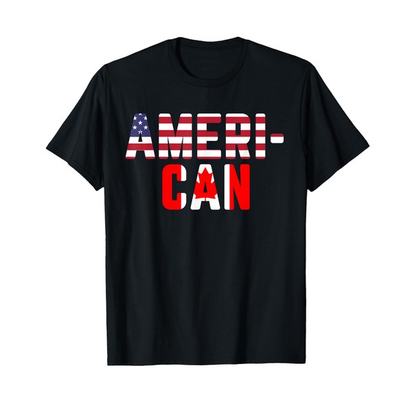 - T-shirt features "Ameri" with the American flag projected thru the text and "can" with the Canadian flag projected thru the text, to form "American". Perfect tee to wear to show your American / Canadian pride.