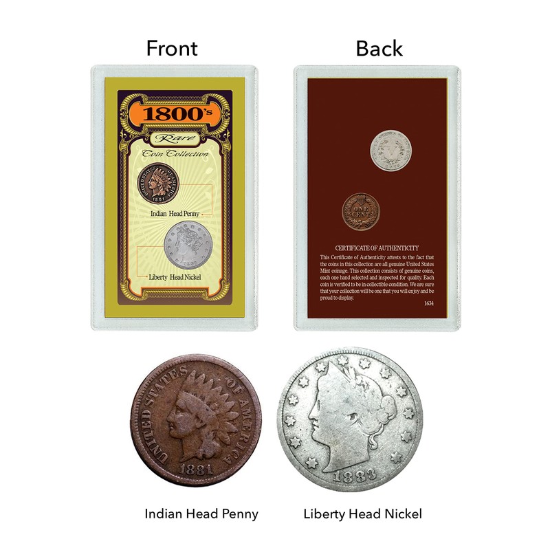 - COLLECTIBLE - The coins in the 1800s collection make a historic statement with coins over 100 years old. The US genuine two coin set includes an Indian Head penny and a Liberty Head nickel. It begins with an Indian Head penny designed by James B. Longacre, depicting Liberty in a war bonnet and minted between 1859 and 1909 and includes a Liberty Head nickel designed by Charles E. Barber, with 13 stars honoring our original colonies, struck between 1883 and 1912.