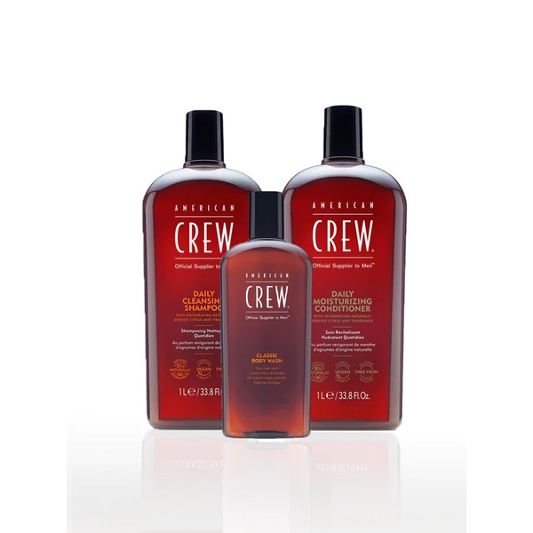 The American Crew Hair & Body Bundle includes 1 x American Crew Daily Cleansing Shampoo 1000ml, 1 x American Crew Daily Moisturizing Conditioner 1000ml, and 1 x American Crew Classic Body Wash 100ml.