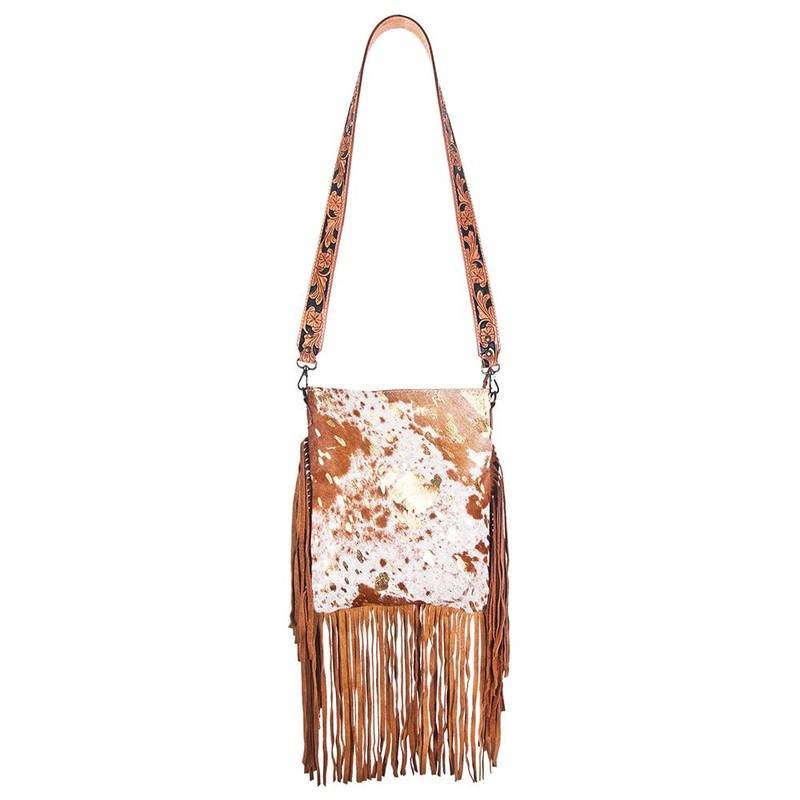 American Darling Messenger Bag ADBGS192ACGO Metalic Paint Embelished Cow Hide, Western Fringe, Removable Leather Strap