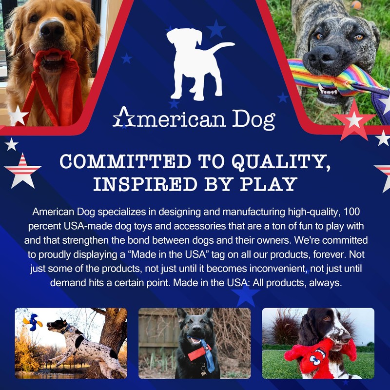 In 2014, American Dog was born with a commitment to crafting premium, USA-made toys and accessories that enhance the bond between dogs and their owners. Each creation echoes Gracie's spirited nature, reflecting our unwavering dedication to fostering durable, interactive play. At American Dog, we are proud to offer dog toys and accessories that are 100 percent American-made. Each product is hand-produced daily with a focus on enhancing the bond between dogs and their owners.