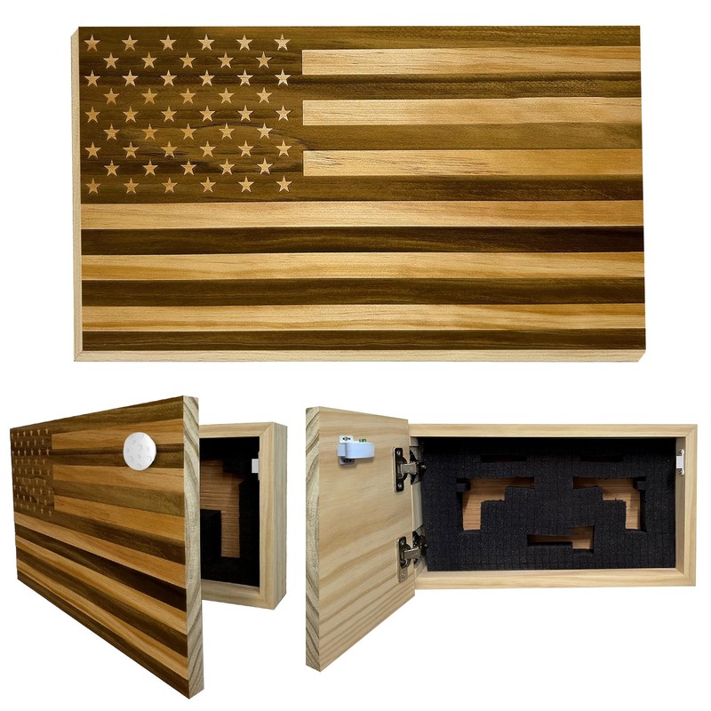 Look no further for American Flag hidden gun storage. This concealed American Flag storage box is made from solid wood and engraved with Old Glory. This concealed storage box includes a magnetic lock to secure your gun yet once the key is applied it will be accessible in seconds. An included foam insert is easily customized to perfectly fit your gun. It contains hundreds of small perforated squares that are easily removed to fit the exact shape. SHIPS FOR FREE!