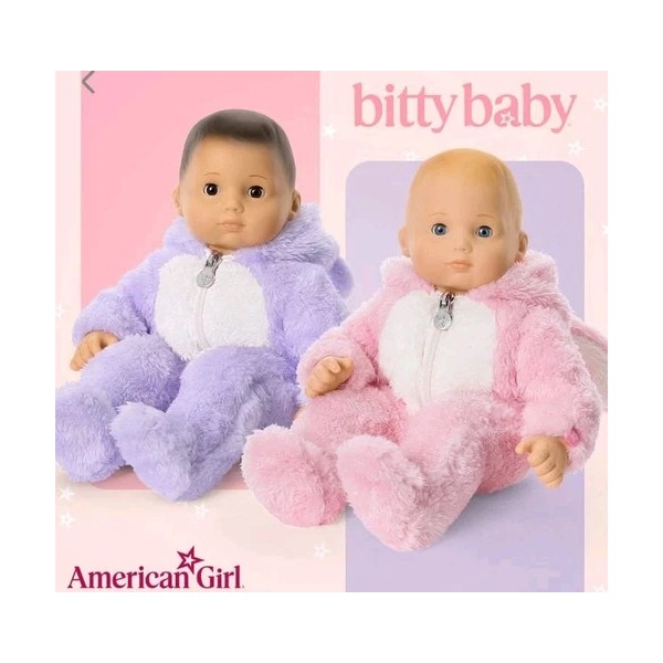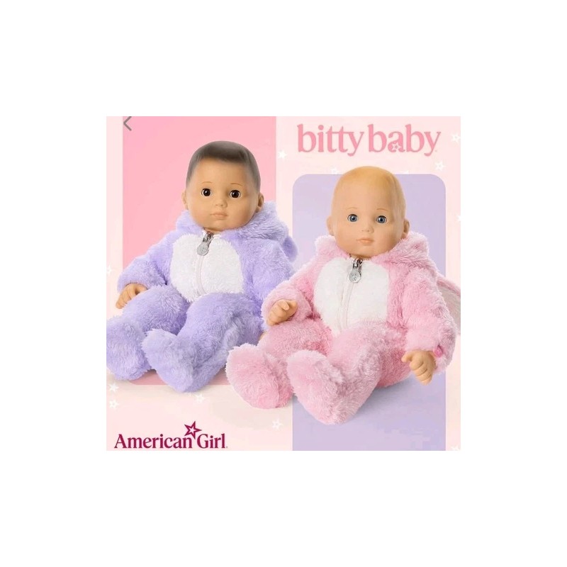 Dress your American Girl Bitty Baby in adorable outfits with these two sets that include a playful pink bunny and a lovable lavender bear one-piece outfits, perfect for Easter festivities. The outfits are designed to fit 15-inch Bitty Baby dolls and come in their original, unopened packaging, ensuring they are pristine and perfect for gifting or collection.
