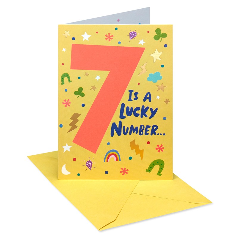 - This birthday card by American Greetings is perfect for any 7 year old and features fun bright colors with gold foils.