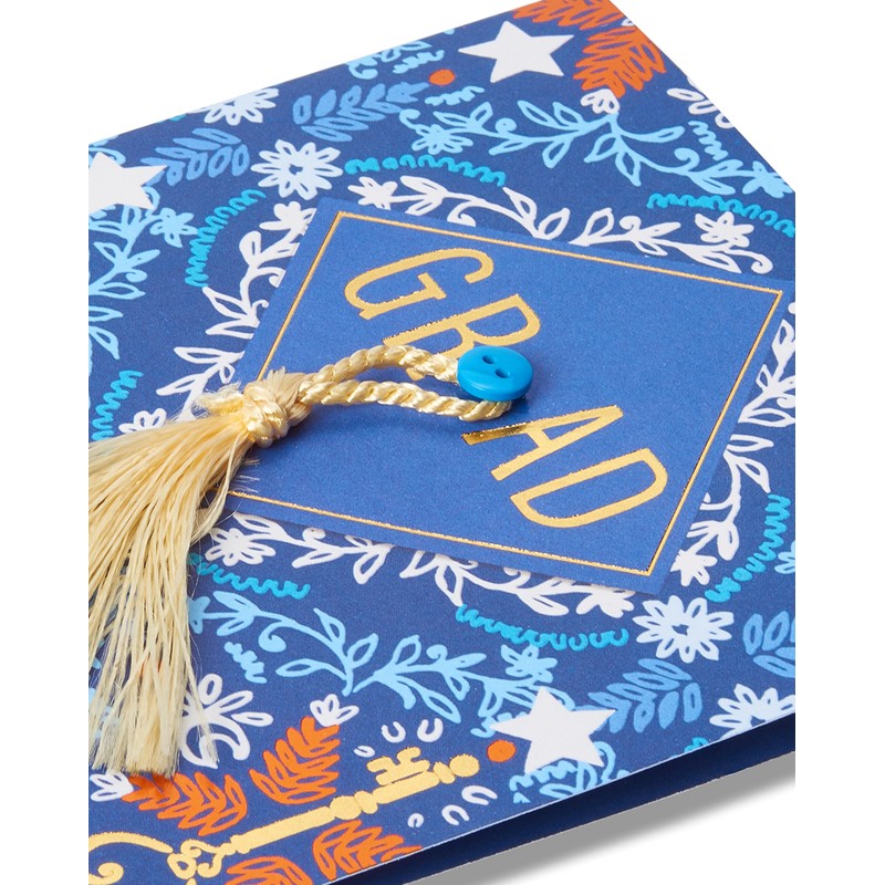- This graduation card features tassel and button attachments and shiny gold foil embellishments