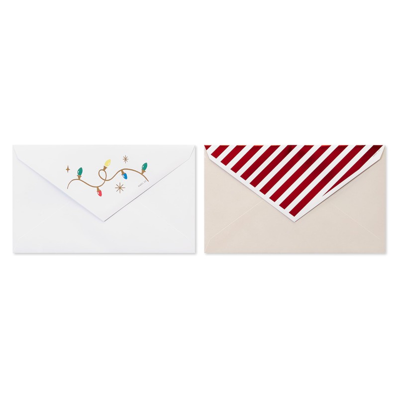 - Pack of envelopes includes two design, stripes (5), and holiday lights (5)