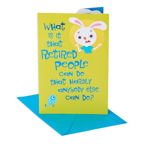 Make them laugh as they close one chapter and open another heading into retirement. With blue foil lettering on the front of the card, open to find an adorable pop-up feature and glitter embellishments to send the retiree a bevy of well wishes. American Greetings offers exceptional greeting cards, gift wrap and celebration products so you can connect in ways that fit your personality and authentic style.