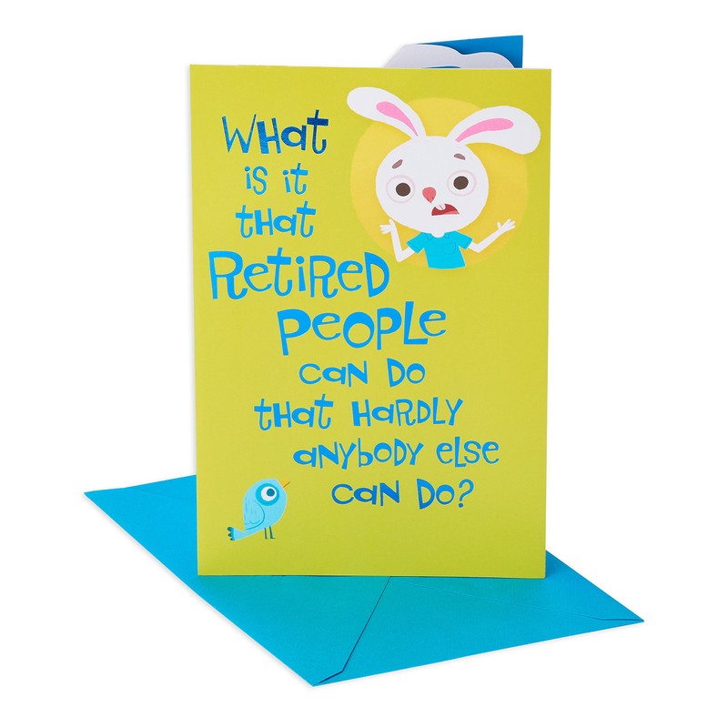 - Make them laugh as they close one chapter and open another heading into retirement. With blue foil lettering on the front of the card, open to find an adorable pop-up feature and glitter embellishments to send the retiree a bevy of well wishes.