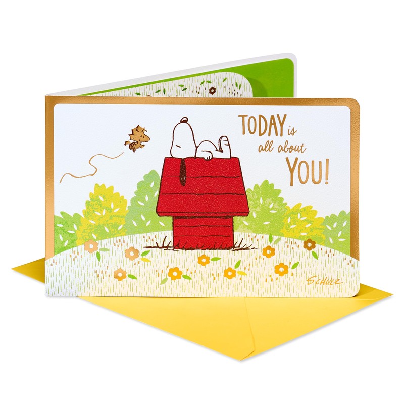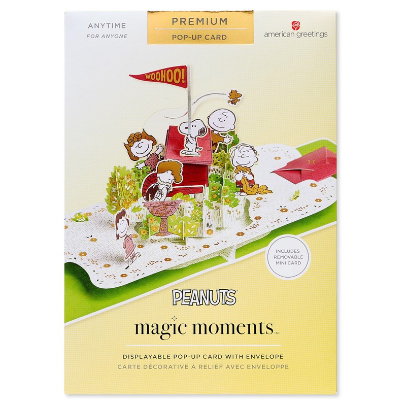 • This thinking of you card unfolds to a delightful 3D pop-up of the Peanuts gang, complete with Snoopy's doghouse and playful details