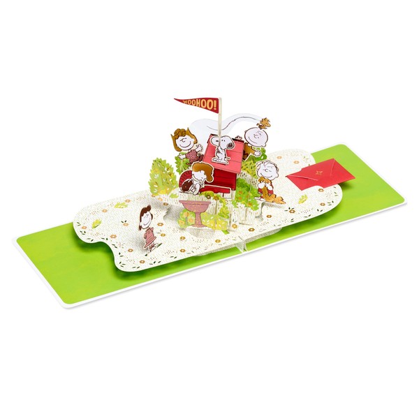 - This thinking of you card unfolds to a delightful 3D pop-up of the Peanuts gang, complete with Snoopy's doghouse and playful details