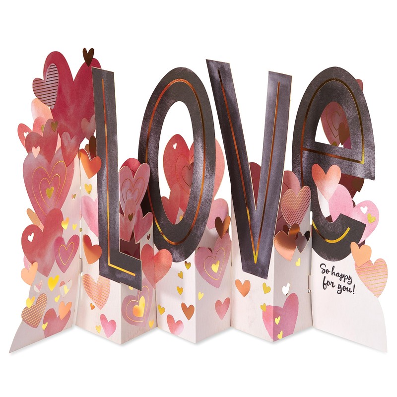 - This decorative romantic Pop-up card for couple features bold letters of "Love" surrounded by hearts, perfect for congratulating any special couple on their wedding, engagement, or anniversary