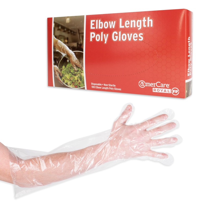 American Health Service Royal Disposable Elbow Length Poly Gloves, 21.5 Inch, Box of 100, Food Safe, Latex Free