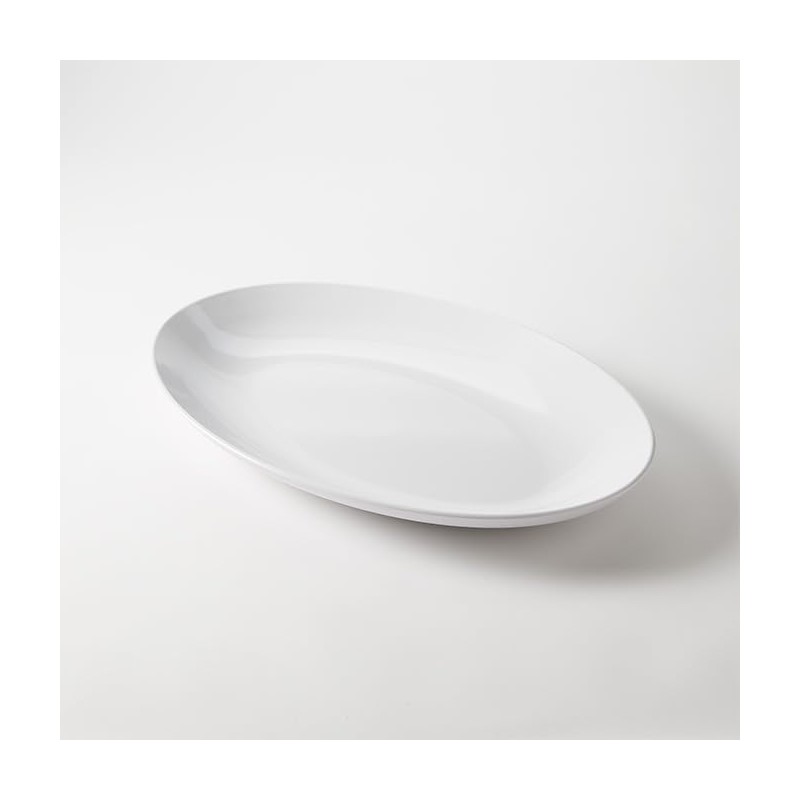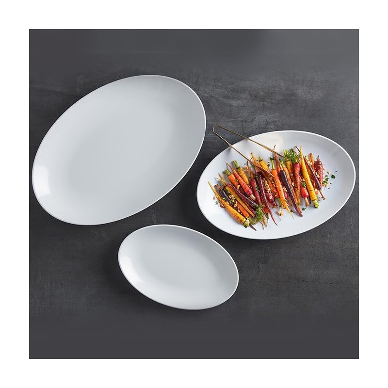 - High-style oval serving shapes add depth and beauty to the buffet, offered in your choice of dual-tone matte black or matte white with a glossy white center. Made of sleek yet durable melamine, these oval platters offer ample room for serving anything from appetizers, salads to entrees.