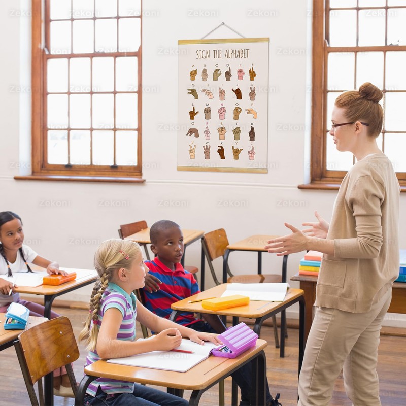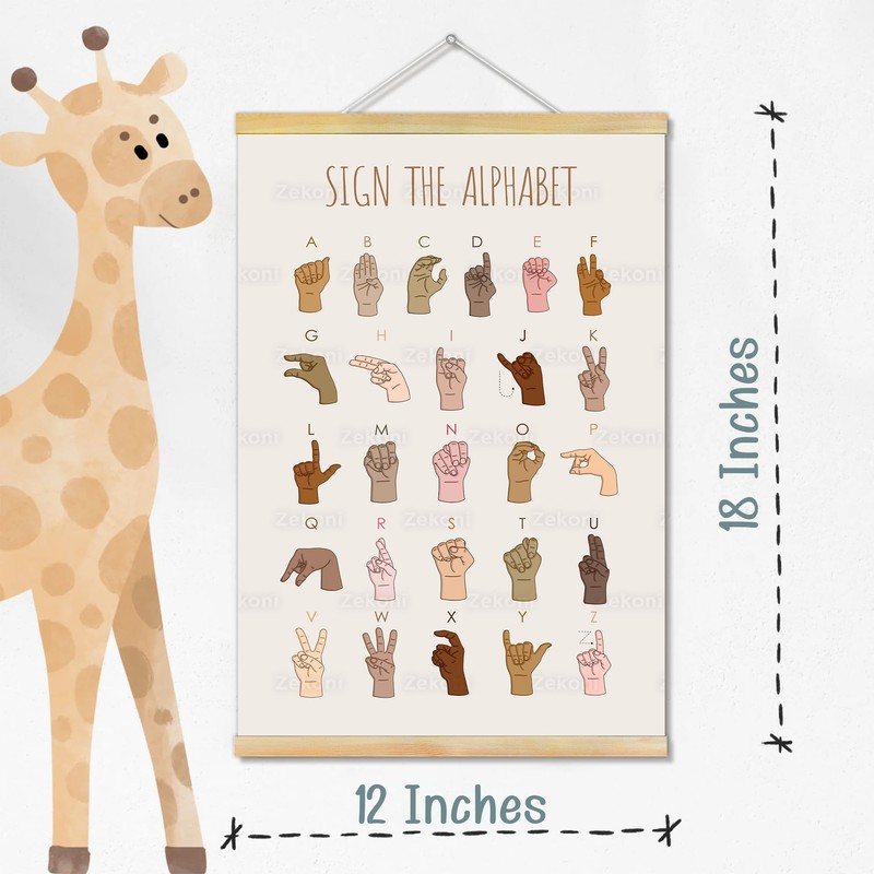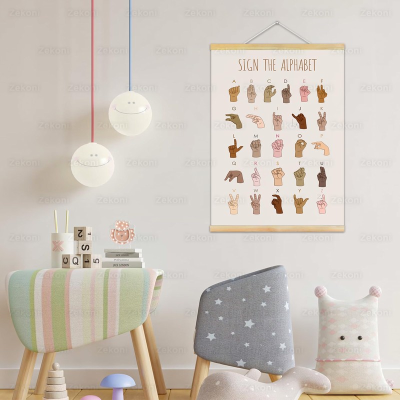 - READY TO HANG: The Sign Language Alphabet canvas poster for kids is designed with a sturdy wooden hanger frame. Right out of the box, it is ready to hang on a wall hook and you can enjoy your new canvas with the utmost ease.