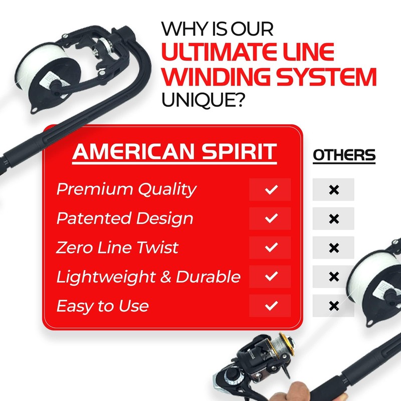 - ELIMINATES YOUR LINE TWIST: The American Spirit Ultimate Line Winding System is the must-have fishing reel spooler tool for every angler. Its compact, durable, and user-friendly design ensures hassle-free spooling of spinning and baitcasting reels, eliminating annoying knots and line twists. Simplify your fishing experience with this essential fishing line spooler machine.