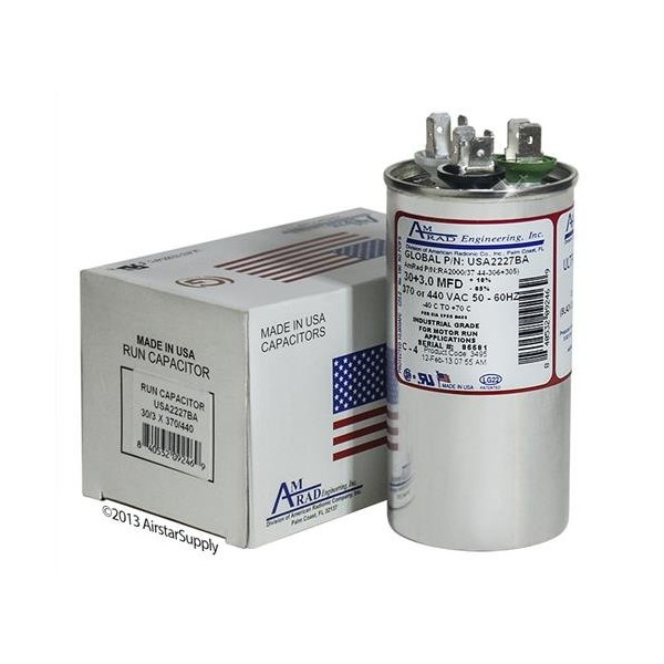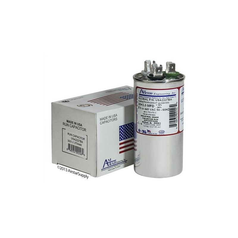 American Standard Replacement - 30 + 3 uf/Mfd 370/440 VAC AmRad Round Dual Universal CapacitorReplacement Made in The U.S.A.