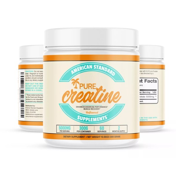 American Standard Supplements’ Pure Creatine Powder contains 5 gram per serving, 60 servings, total of 300 gram pure creatine. Our pure creatine powder will increase strength, enhance athletic performance, aid recovery, and maximize muscle growth.