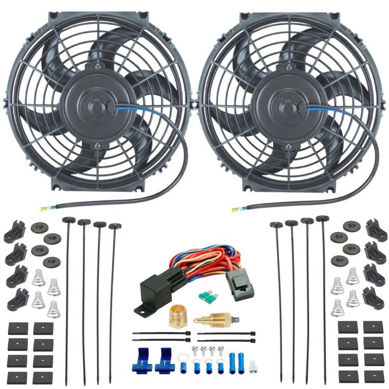 Specs Per Fan: Blade Size - 10 Inch Blade Type - Curved Motor Size - 80 Watts CFM Rating - 1600 RPM Rating - 2250 Amp Draw - 8 Amps Material - Plastic Shroud/Steel Motor Dimensions - 11.5" x 10.75" x 2.5" thickness at center x 1.5" thickness at edge ** Thermostat Kit:**