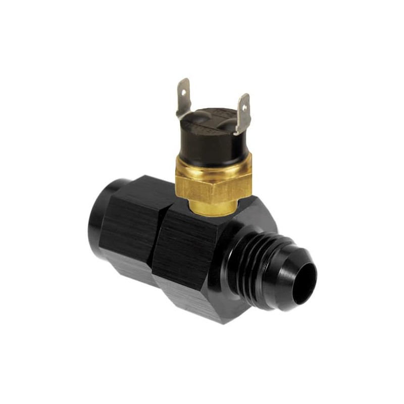 Automotive oil cooler in-line hose fitting fan thermostat switch kit. Select the AN fitting size to thread directly onto the coolers inlet. Circuit closes at selected temperature and powers 12V accessory. Fitting is black anodized aluminum for a corrosion resistant design. Measures all liquid temperatures including water, coolant and oil. Complete in-line hose thermostat wiring kits available in our store.