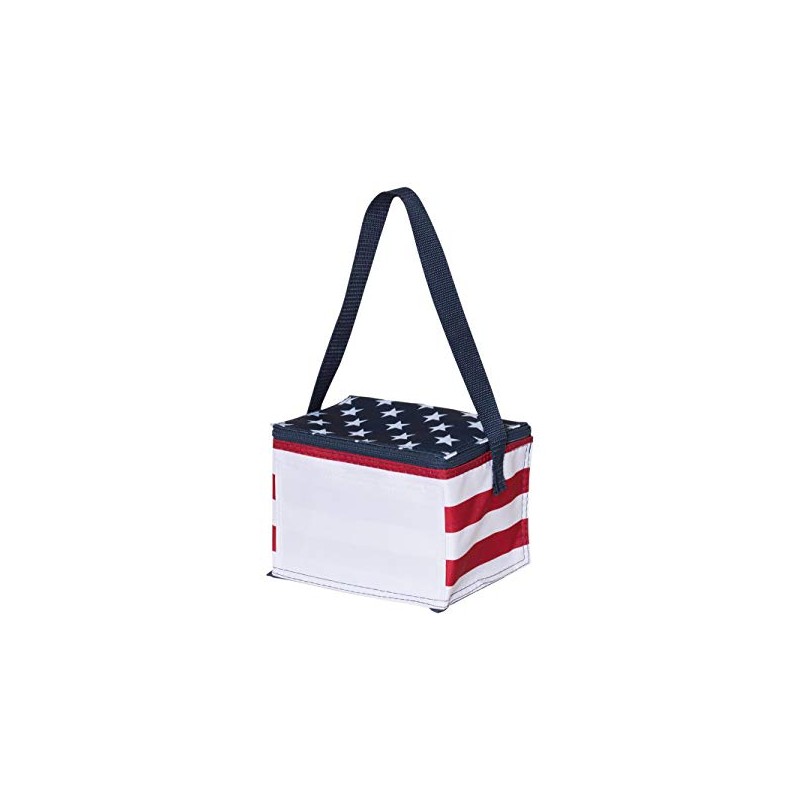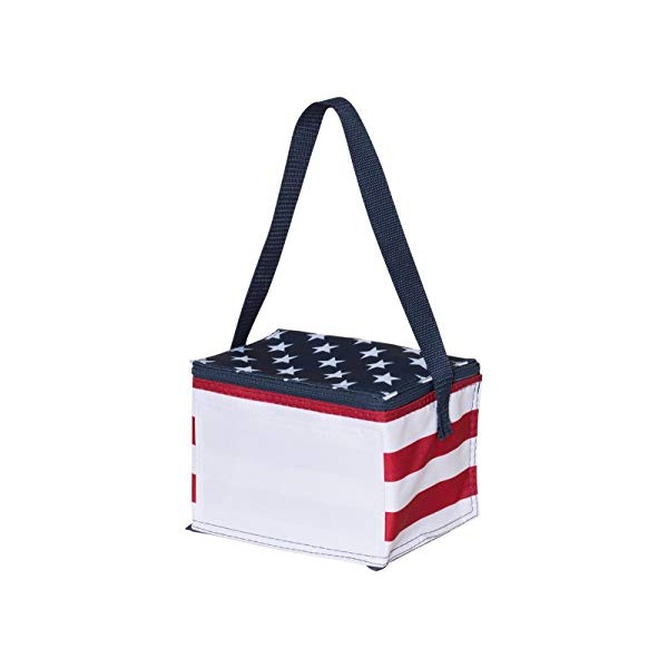 600D polyester. Holds six cans. Insulated with lead-free PEVA lining. Large white print area on open front pocket. Star and stripes pattern. 22 1/2" adjustable blue strap.