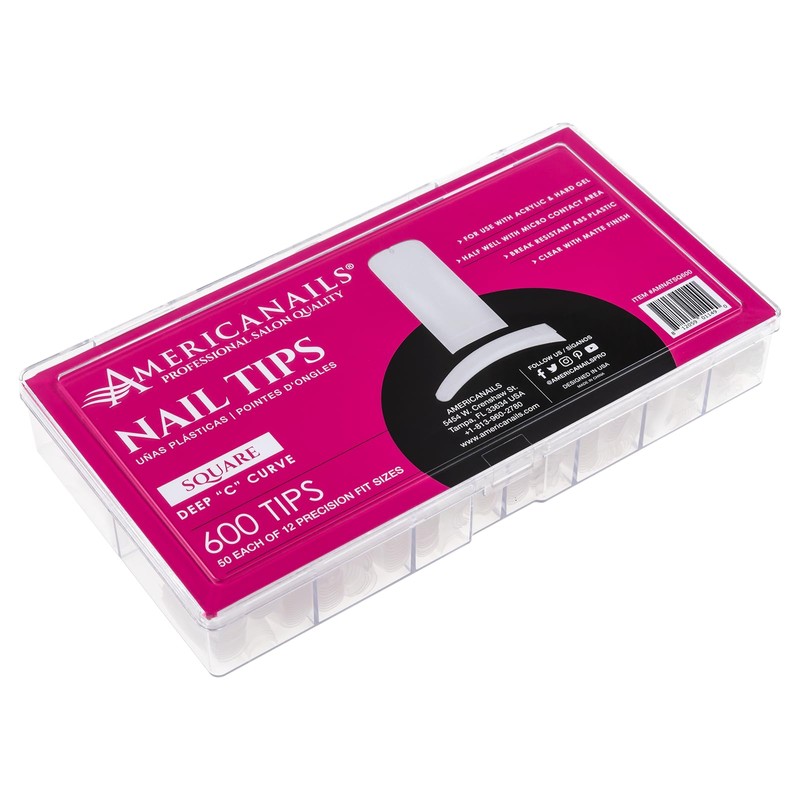 Americanails Nail Tips - Square (Deep "C" Curve) 600ct – Ideal for Acrylic and Hard Gel, Break Resistant ABS Plastic, Clear Matte Finish, Half Well with Micro Contact Area