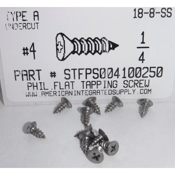 #4x1/4 Undercut Flat Head Phillips Tapping Screws 18-8 Stainless Steel. These are also available by the piece at our web site. Larger quantities are available, Please inquire. All items are packaged in heavy duty ziptop bags and well labeled, perfect size for bin restocking! We carry 1000's of other fasteners in stock for immediate shipment. We have over 50 years of experience serving Metro Detroit. Send us your requirements. For prompt Quotations, E-mail; sales at americanintegratedsupply dot com or visit us at; www dot americanintegratedsupply dot com