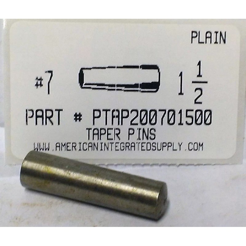 | #7X1-1/2 TAPER PINS STEEL PLAIN .409" LARGE END DIAMETER. These are also available by the piece at our web site. All items are packaged in heavy duty ziptop bags and well labeled, perfect size for bin restocking! We carry 1000's of other fasteners in stock for immediate shipment. We have over 50 years of experience serving Metro Detroit. Send us your requirements. For prompt Quotations, E-mail; sales at americanintegratedsupply dot com or visit us at; www dot americanintegratedsupply dot com |