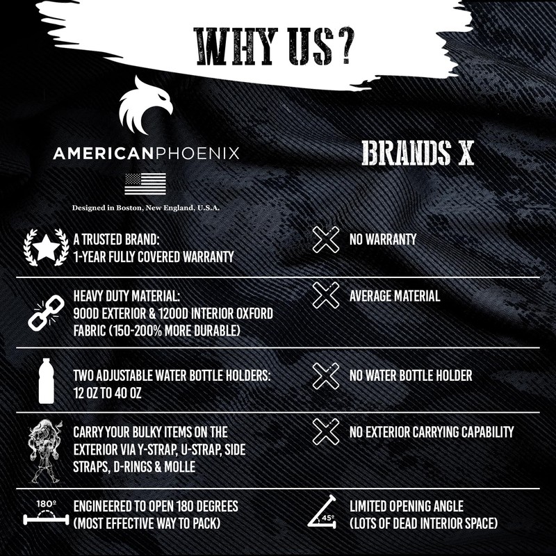 - 🇺🇸 AMERICAN COMPANY: AMERICANPHOENIX backpacks come with a one-year full warranty. Each military backpack features a removable Velcro patch of the American flag and our motto "Dare Mighty Things," inspired by President Theodore Roosevelt's 1899 "Strenuous Life" speech. Our products have been purposefully built to deliver reliable performance in unreliable conditions.