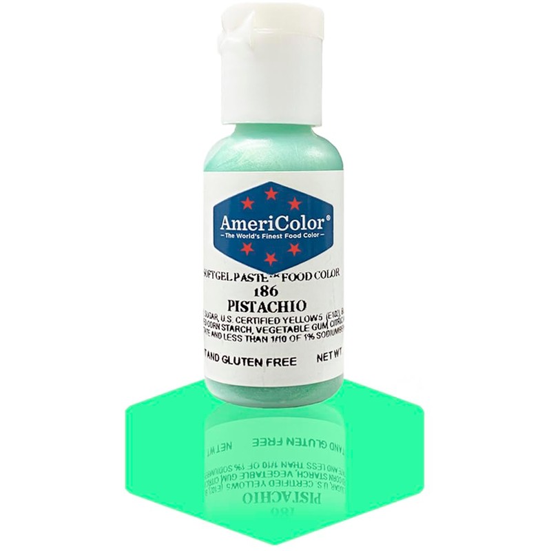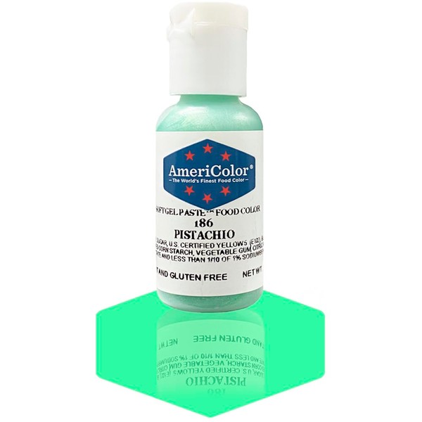 - Single .75 ounce bottle of Pistachio Soft Gel Paste food color. Each bottle is formulated with the highest quality ingredients to achieve the most vibrant results with the least amount of product.