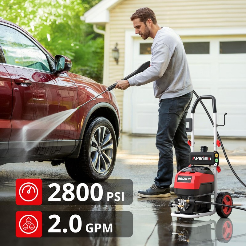 AMERISUN 2800 PSI Pressure Washer, 2.0 GPM Electric Power Washer with Foam Tank, 5 Quick-Connect Nozzles & 8" Wheels, Portable High-Pressure Cleaner for Car, Deck, Fence & Outdoor Use