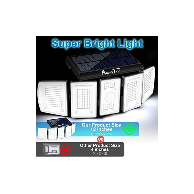 - Ultra Bright Solar Motion Sensor Lights - The AmeriTop solar security light with the three heads design, Built-in 300 super bright LED. Each of them is SMD 2835 LED. It can produce up to 1100lm 7000K high brightness output. The conversion rate of our upgraded polycrystalline silicon solar panels is as high as 20%. Incredible photocell efficiency, also working great in winter.