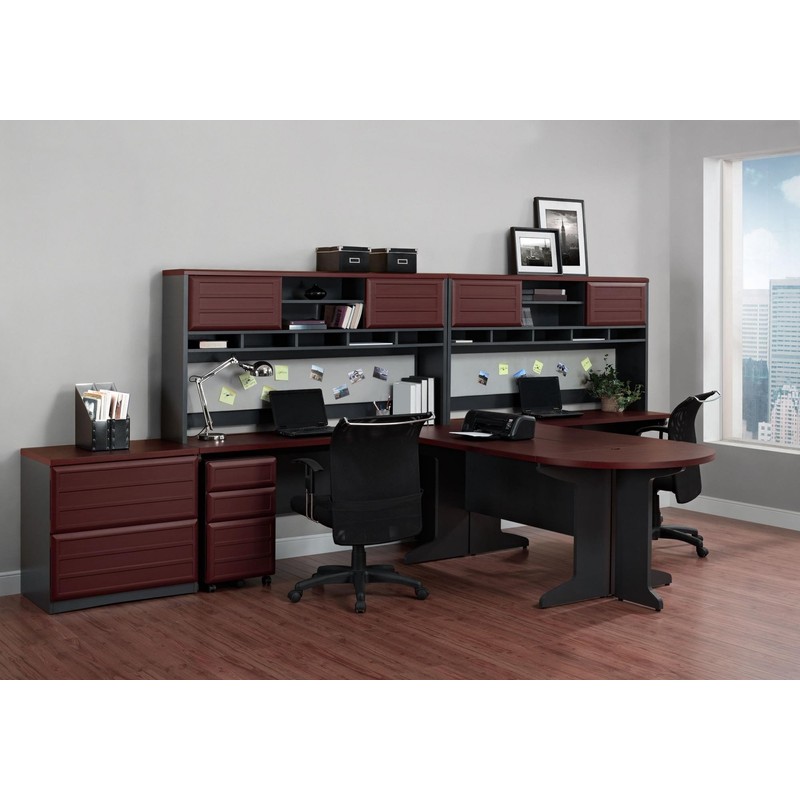 • The two-tone cherry and gray finish and curved lines give the unit a beautiful minimalist design that’ll fit any office decor