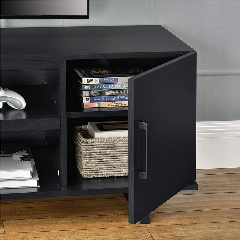 - Open and concealed storage offers ample space to organize your video components and and features wire management holes to make plugging in devices simple. Store DVDs and games behind the 2 doors that each conceal 1 adjustable and 1 fixed shelf