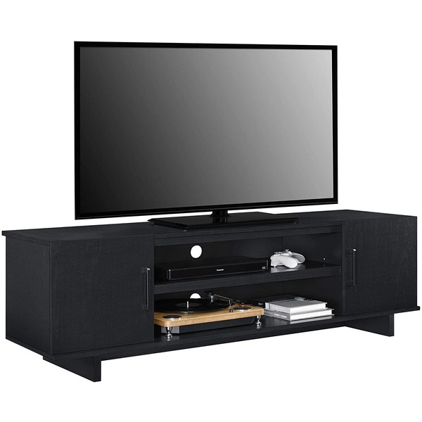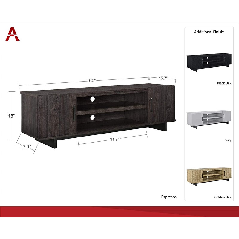 - The TV Stand ships flat to your door and 2 adults are recommended to assemble. The 2 center shelves can hold 20 lbs. each and each shelf behind the doors will hold 15 lbs. Assembled dimensions: 18.03”H x 60”W x 17.13”D