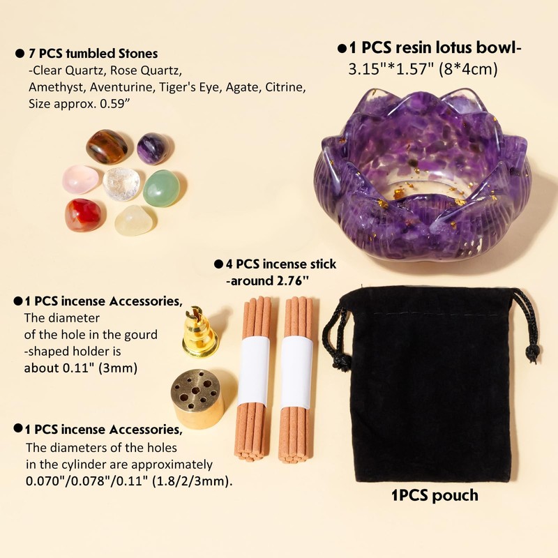 - The Resin Lotus Bowl is approximately 3.15"*1.57" (8*4cm).The diameters of the holes in the cylinder are approximately 0.070"/0.078"/0.11" (1.8/2/3 mm).The diameter of the hole in the gourd-shaped holder is about 0.11" (3 mm).The length of the incense stick is around 2.76".7 Small Tumbled Stones, Clear Quartz, Rose Quartz, Amethyst, Aventurine, Tiger's Eye, Agate, Citrine, Size approx. 0.59”。The size of the gift box is approximately 5.12" × 3.35" × 1.65" (13 × 8.5 × 4.2 cm).