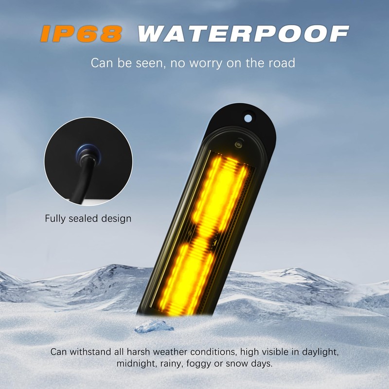 - 【QUALITY MATERIAL】Our emergency strobe lights for trucks adopt durable aluminum alloy housing and high-transmittance PC lens, IP68 waterproof, quick heat dissipation, scratch resistant, corrosion resistance, high temperature resistance, UV resistance, won't fade even for long exposure in sunlight.