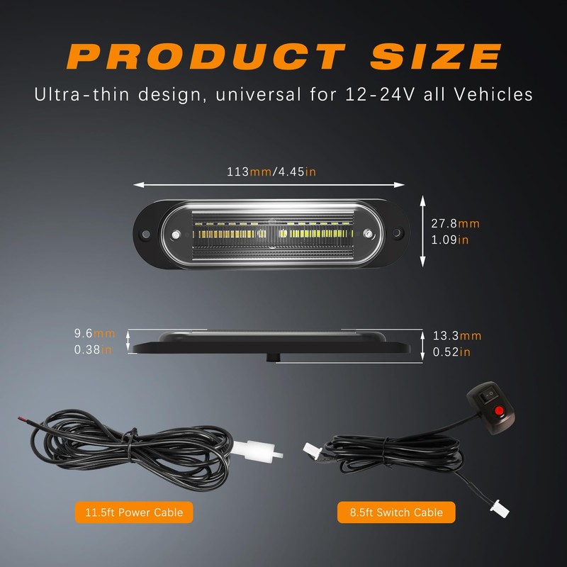 - 【EASY INSTALLATION 】Surface mount, easy to install. Each light has a 11.5 FT long wire to meet the needs of various large vehicles. Equipped with 12V cigarette lighter power connection.Install with sponge pads and screws, can be mounted on the grille, bumper or side of truck without scratching the vehicle.
