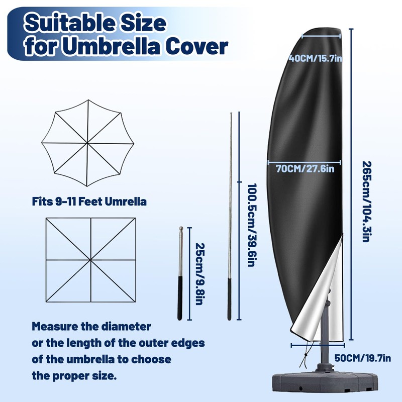 - 【Perfect Size】This parasol cover with a total length of 265 cm, 40 cm W (top) / 70 cm W (middle) / 50 cm W (bottom) is suitable for 9-11ft umbrellas. Please measure the size of your parasol to ensure a good fit. This cover is suitable for most patio parasols.