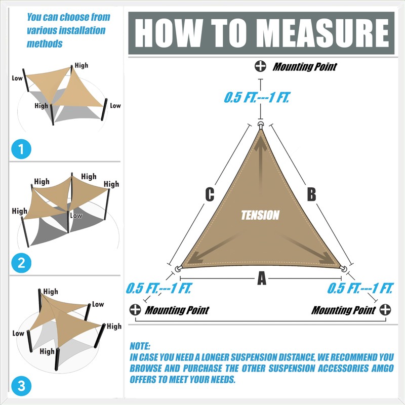 - 【Easy & Flexible Installation】: Effortlessly install our shade sail by determining the area, selecting the shape, and securely attaching it to trees, roofs, walls, or other surfaces using mounting hardware kits. For optimal performance, ensure that each corner has a gap of at least 0.5 ft between D-Rings and poles, or reduce by 1 to 1.5 ft for each side.