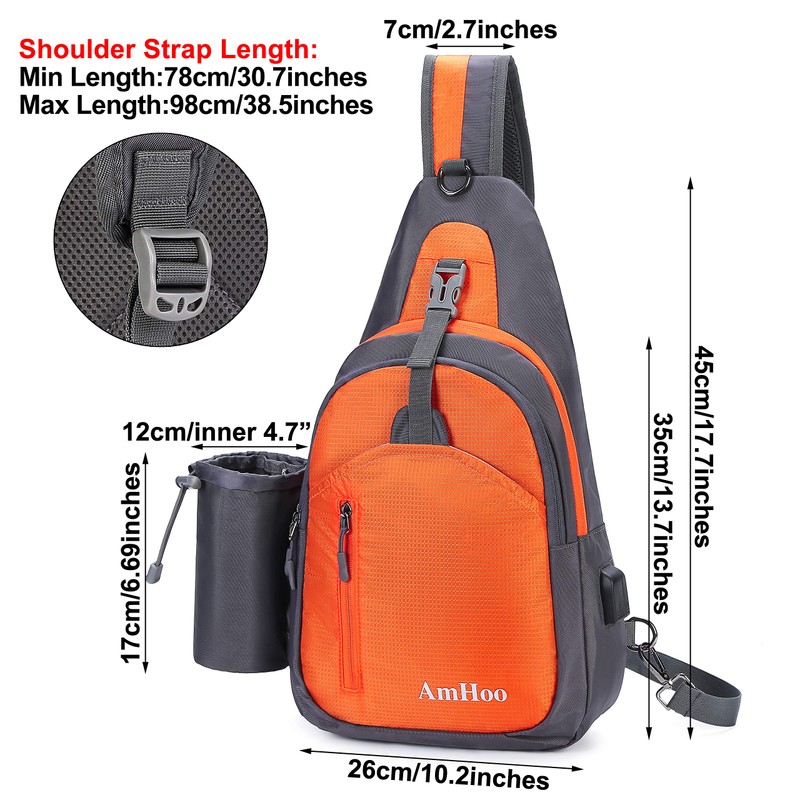 This is an ambidextrous sling bag for quick and hands-free carry. Material:Nylon, non-toxic, breathable waterproof, easy to clean, wearable BIG CAPACITY:1 main zipper compartment, 2 front zipper pocket,1 detachable water bottle holder side pocket UPGRADED DESIGN:Earphone Hole and USB Charging Port,and front buckles to protect your stuff more safely Multipurpose:Hiking,travel,camping,school supplies,shopping,biking,school etc
