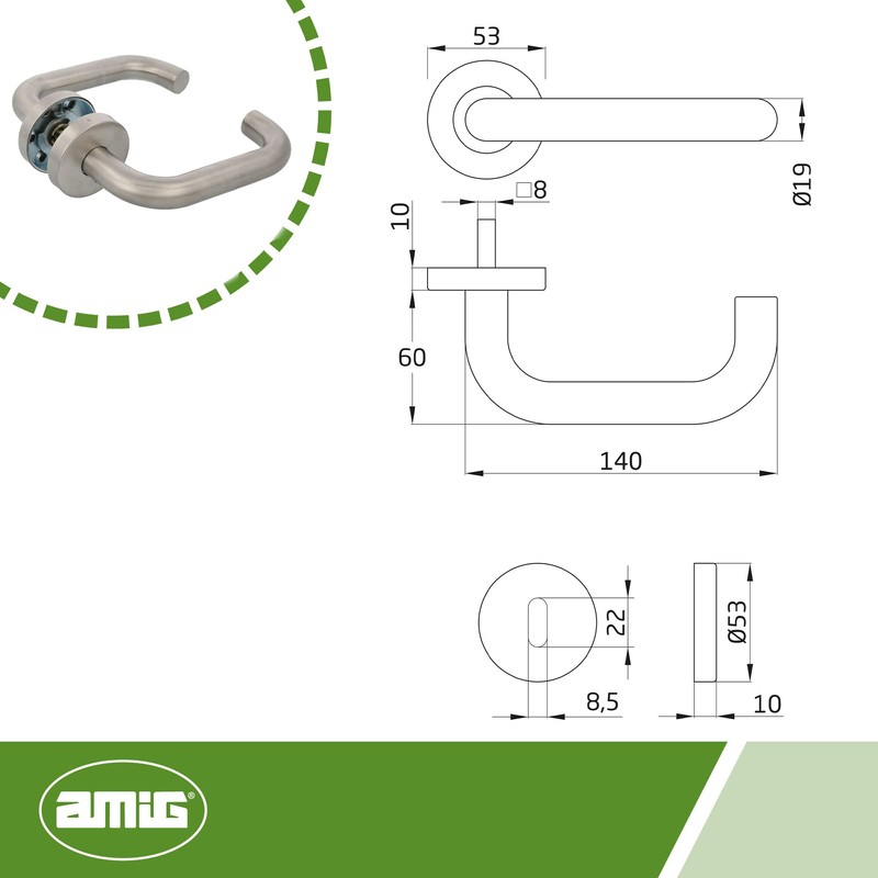 Amig - Door Handle Set with Rosette | Model 3RGX | 140 x Diameter 19 mm | 8 mm Square | Elegant and Simple Design | Matte Stainless Steel