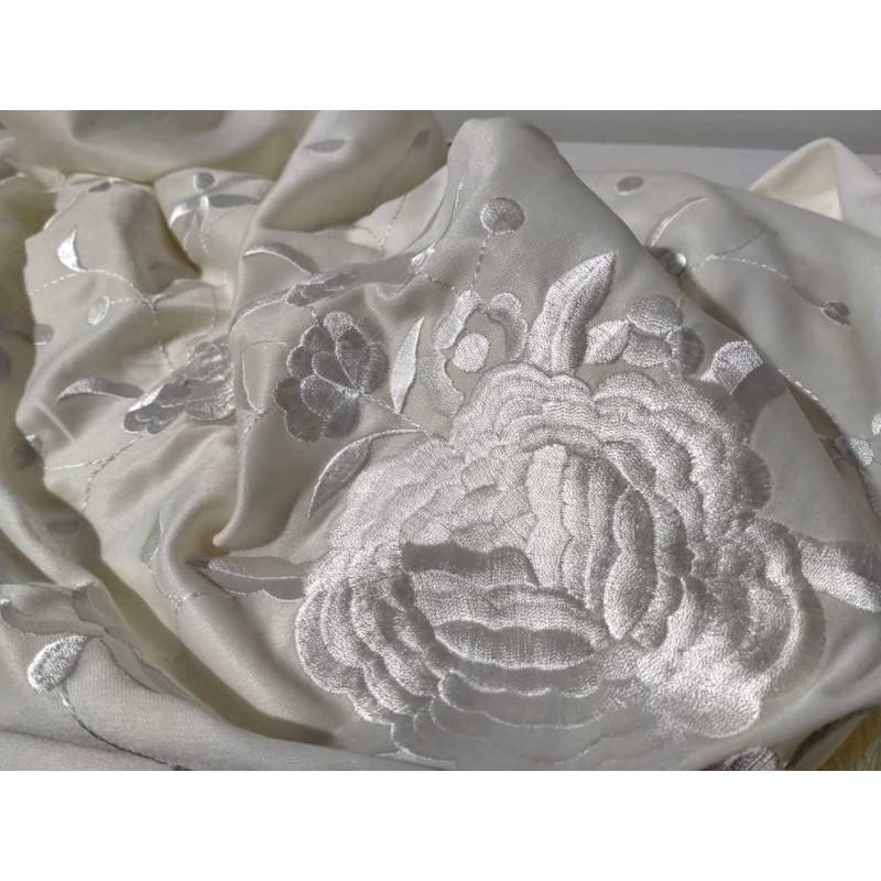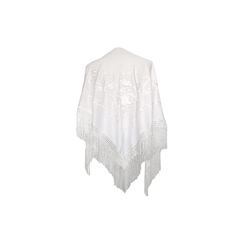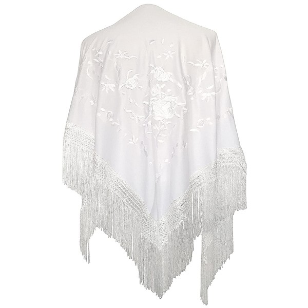AMINA White Flamingo Peak Shawl with Fringes - White Embroidery on One Side - Large Size 190 x 90 cm
